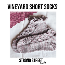 These socks are knitted toe up using Judyās Magic cast-on method to start. Can be knitted both ā using the Magic Loop technique or double pointed needles. After finishing the toe, a beautiful lace pattern highlights the upper part of the sock, reminding us of vines. A reinforced heel is created by using slipstitches and German short rows. Vineyard socks are finished with a lovely ruffle.